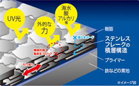 樹脂と強力に親和・接着したステンレスフレークの積層塗膜が、従来の重防食塗料と比較して優れた耐候性、耐食性、耐薬品性を発揮します。